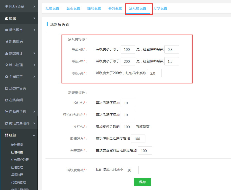 活躍度設置:不同的活動度的用戶可以設置不同的紅包倍率系數,倍率系數影響紅包大小,同時設置好活躍度的提升