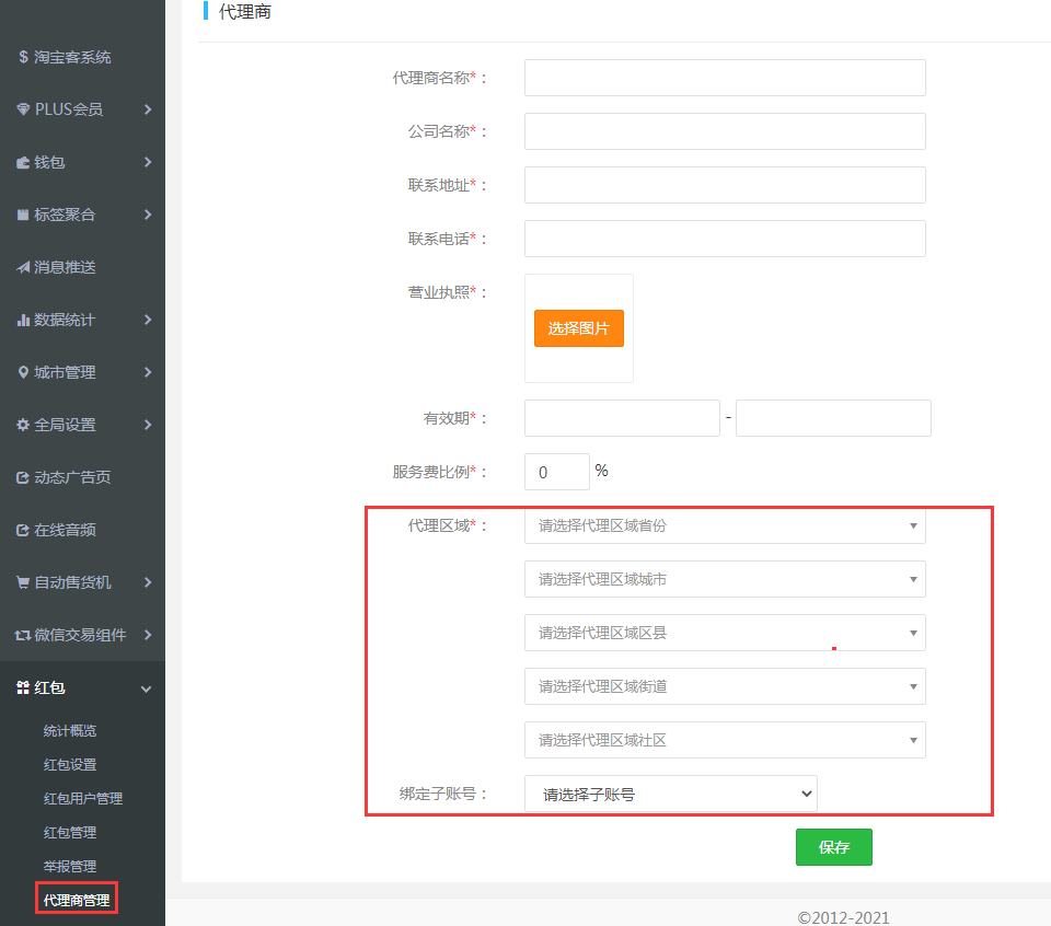 可精確至村鎮街道設定代理商。代理商可對區域范圍內用戶的紅包進行管理,且能按照設定比例從紅包服務費分成。