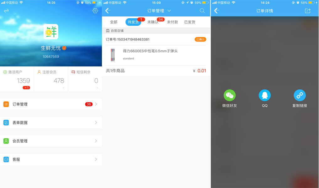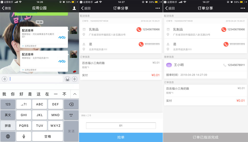 2.登錄手機運營助手,接收訂單之后,進入訂單詳情頁面,點擊右上角的分享界面,把訂單分享到微信、QQ群里,配送員輸入工號進行搶單,搶單成功之后,按照訂單上的地址進行配送。