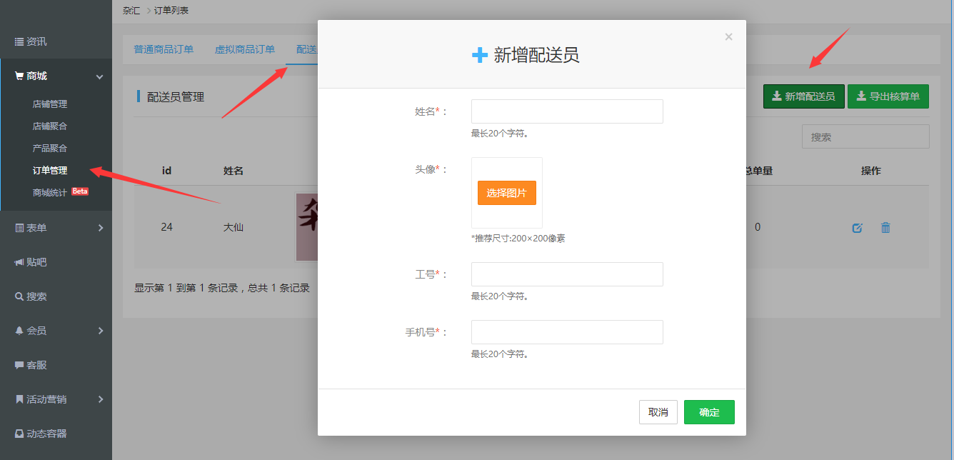 1.運營管理平臺新增配送人員管理頁面,支持為自己的App添加專屬配送人員,支持配送人員姓名、手機、頭像及工號的錄入,更加規范化管理。