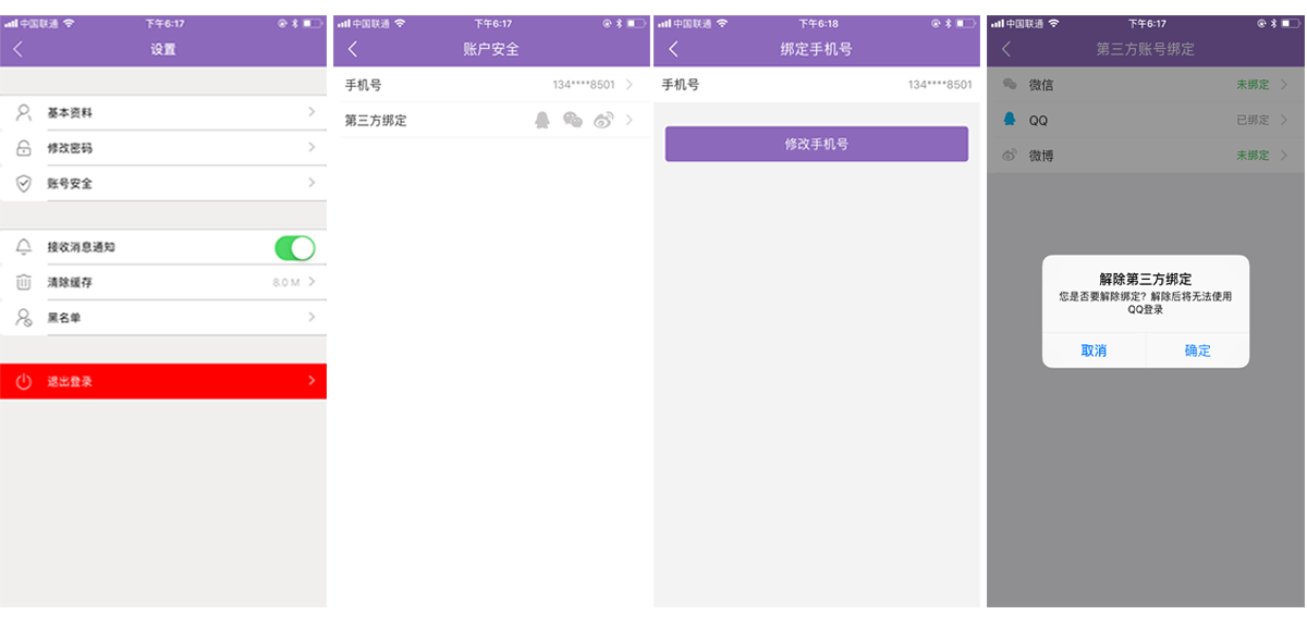2.個人中心設置新添加了“賬號安全”功能,可以進行已經綁定的手機號修改(需已經開通短信驗證才可以進行此操作),以及微信、QQ、微博綁定/解綁。
