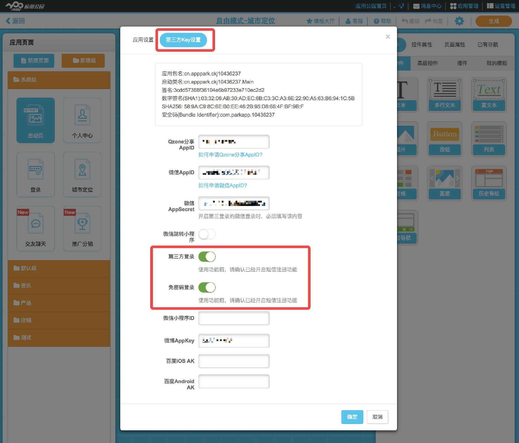 1.登錄制作頁面,進入右上角“設置”-“第三方key設置”,打開第三登錄以及免密登錄按鈕,需要開通app短信驗證(如未開通,請先聯系客服開通),相對應的微信、QQ、微博分享功能必須已經開通并能成功分享,否則無法拉取相應的第三方登錄。