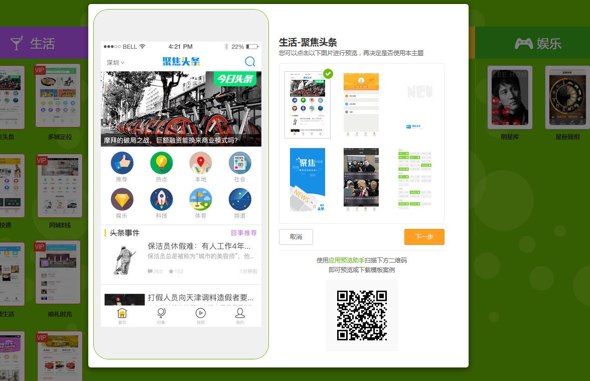 打開應用公園的官網(m.sddishun.com),點擊【開始制作】,注冊賬號即可。進入制作頁面后選擇模式,自由模式的自由度更高一些,但是對操作的熟練度有一定要求。主題模式就是按照平臺上提現有“聚焦頭條”的主題模板,僅需要對圖片文字進行替換,就可以。