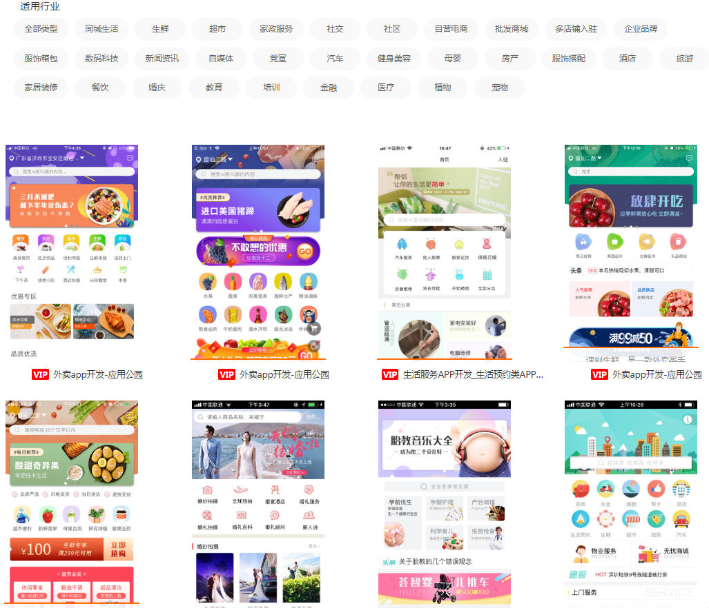 模板類型包括:外賣配送、同城生活、生鮮、超市、企業品牌、家政服務、自營電商、批發商城、多店鋪入駐、社交、社區、服飾箱包、分銷拼團、淘客導購、數碼科技、新聞資訊、自媒體、黨宣、汽車、健身美容、母嬰、房產、服飾搭配、酒店、旅游、家居裝修、餐飲、婚慶、教育、培訓、金融、醫療、植物、寵物