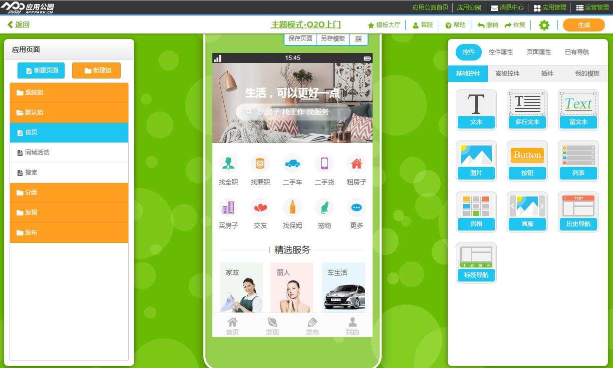 要開發一個功能完善的同城服務app軟件,現在不需要找專業的app定制開發公司,不需要花費幾十萬成本,利用應用公園免編程app在線制作平臺,你自己就能制作一個獨特的同城服務app軟件。