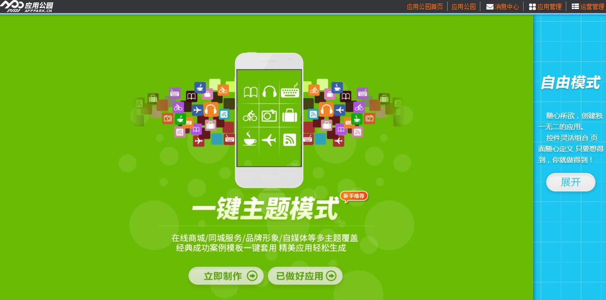 2、選擇開發模式,自由模式就是從零拼圖式制作APP;一鍵主題模式,就是利用那些APP模板制作。通常情況下,都可以找到符合自己需求的模板,按照模板制作。