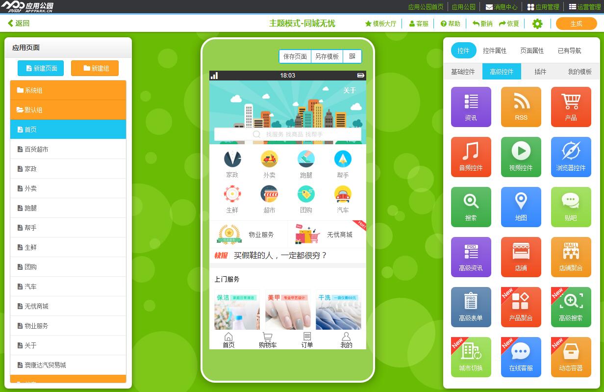因為在應用公園平臺,已經有上百個類似注冊登錄、地圖定位、購物車、在線聊天、會員管理等等的APP功能控件,利用這些開發好的APP功能,完全不需要編程自己就可以做一個APP。