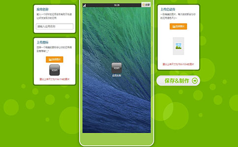 接下來,在選定哪種主題后,就會出現一個在線制作模擬器,為您的app取個名字和logo圖,上傳啟動項圖片,啟動項即是打開該app后,出現的為數不多個頁面。